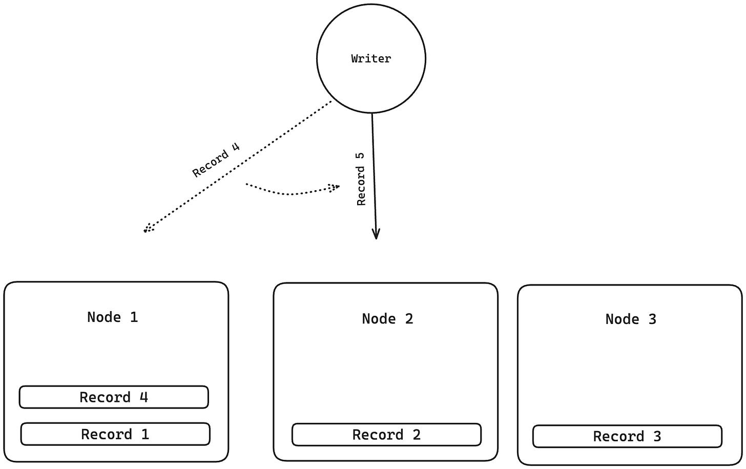For example, if we have 3 nodes/shards and 4 records, then: