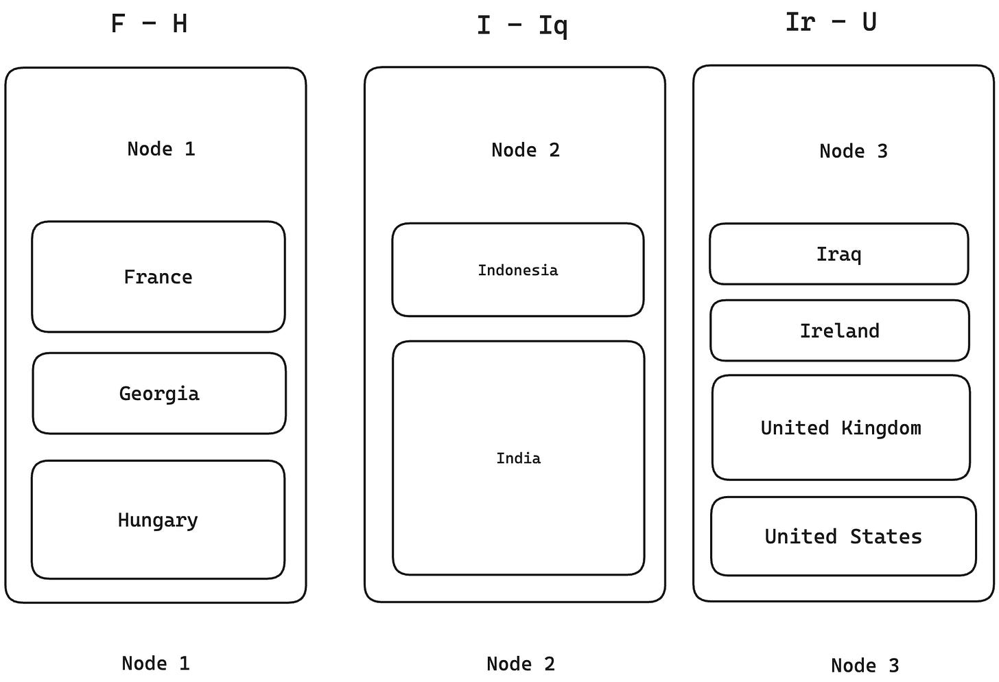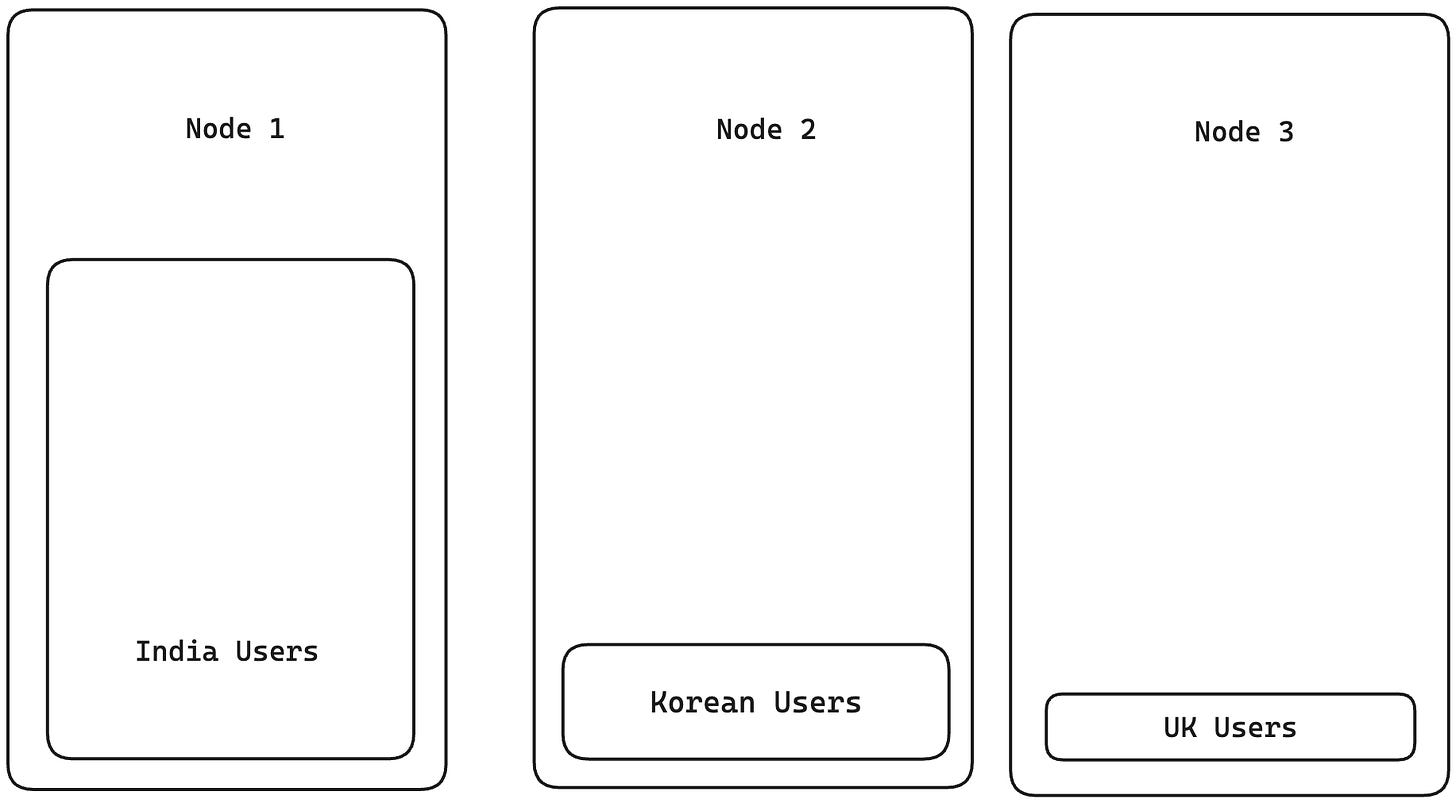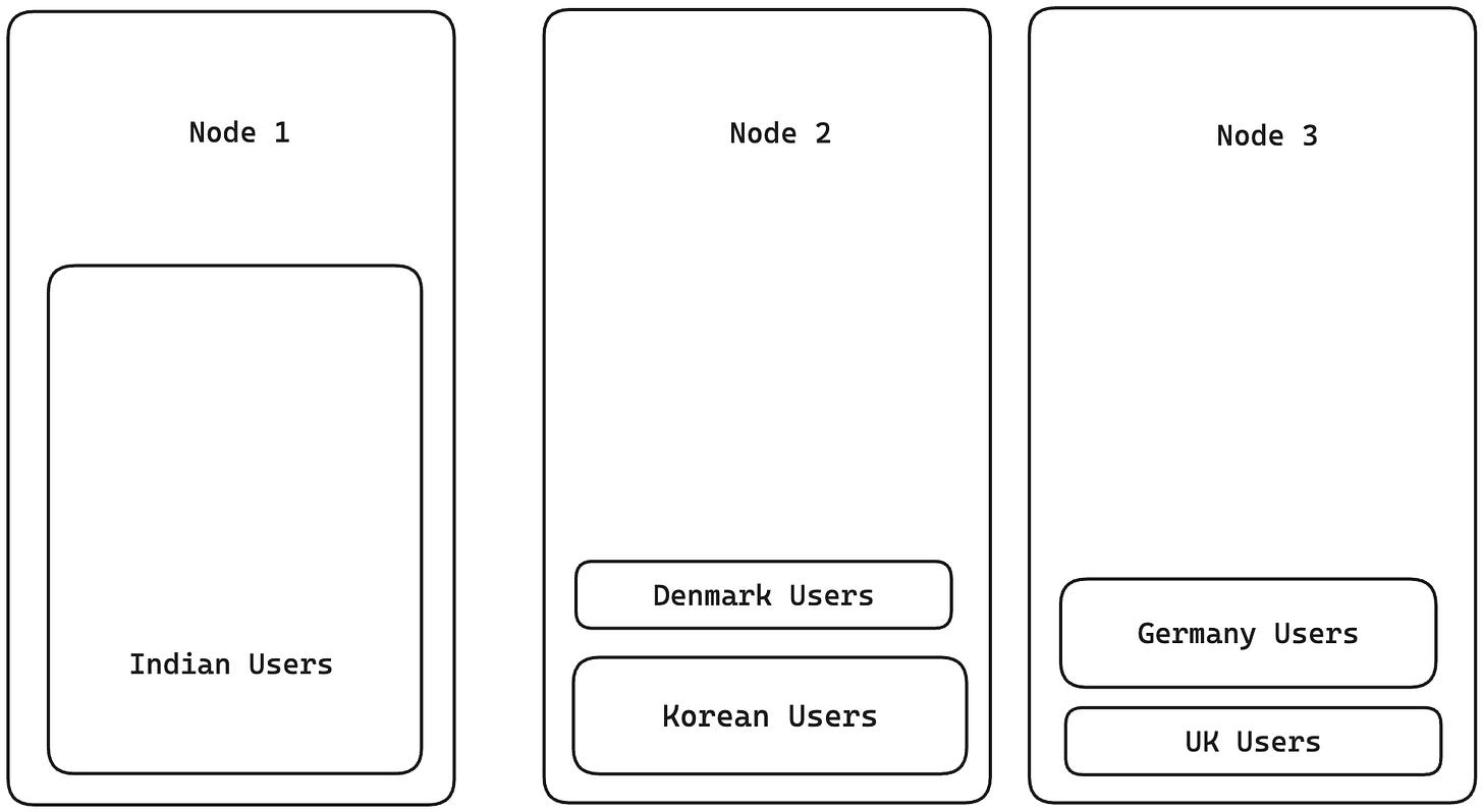 A better approach to partitioning is based on a particular key. For example, say we have a list of people with their names and country of origin. We could partition the list by country of origin. All people from India could be in one partition, all the people from Korea in another, etc. This approach will help us to easily find the node that has a particular person by matching them with the country of origin. The issue with this approach, though, is that it’s prone to skewness and hotspots. Which means that if 80% of people in the data are from India, they will all end up in one node, and the rest of 20% will be across other nodes. So the majority of the system load might be taken up by just one node, which is not desirable. Also, a condition for this approach to succeed is that the value of this attribute should have high cardinality. i.e If there are people only from 4 countries and there are 10 nodes, the data will be stored on only 4 nodes. The other 6 nodes will not have any records assigned to them.